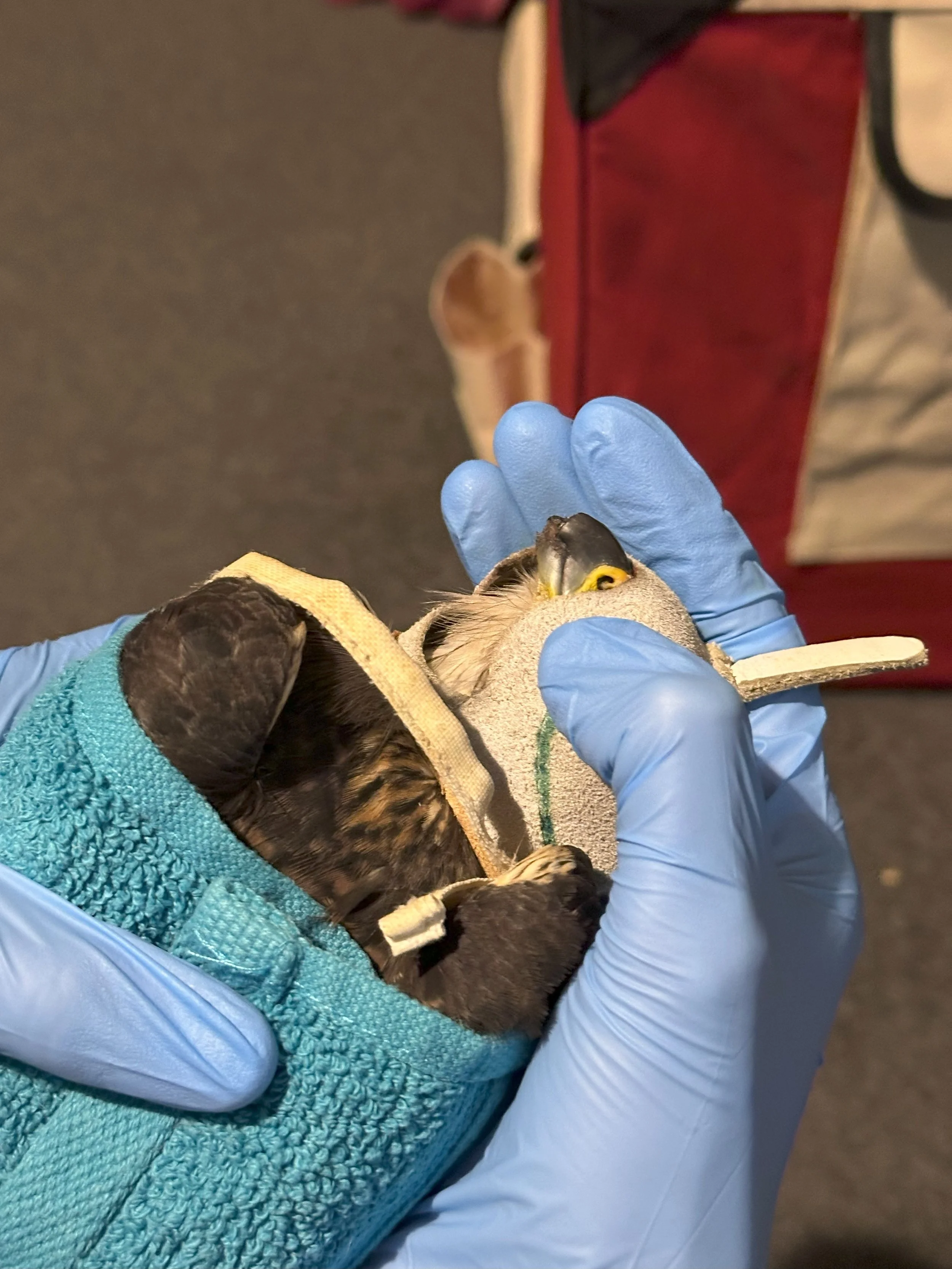 Keep the falcon out of direct sunlight. It will be highly stressed and will want to defend itself, especially with its talons – excessive handling can hurt both you and the bird.
